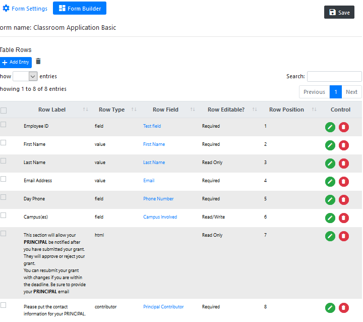 In this section we are going to create a form called "Classroom Application Basic" that uses an individual format. Typically, a row will contain a title or header followed by a value or an entry.